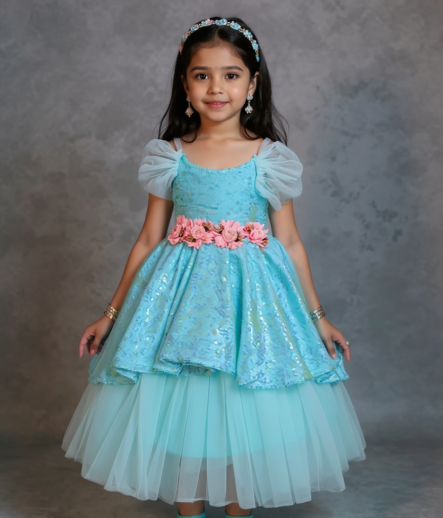 Turn heads with twinkle in the Aqua Sparkle Fairy Gown. Shimmering sequins, delicate tulle, and a vibrant pink floral belt make this a magical dress straight out of a fantasy land — designed by a Fashion Designer in Pune and ideal as a trendy kids loungewear set.