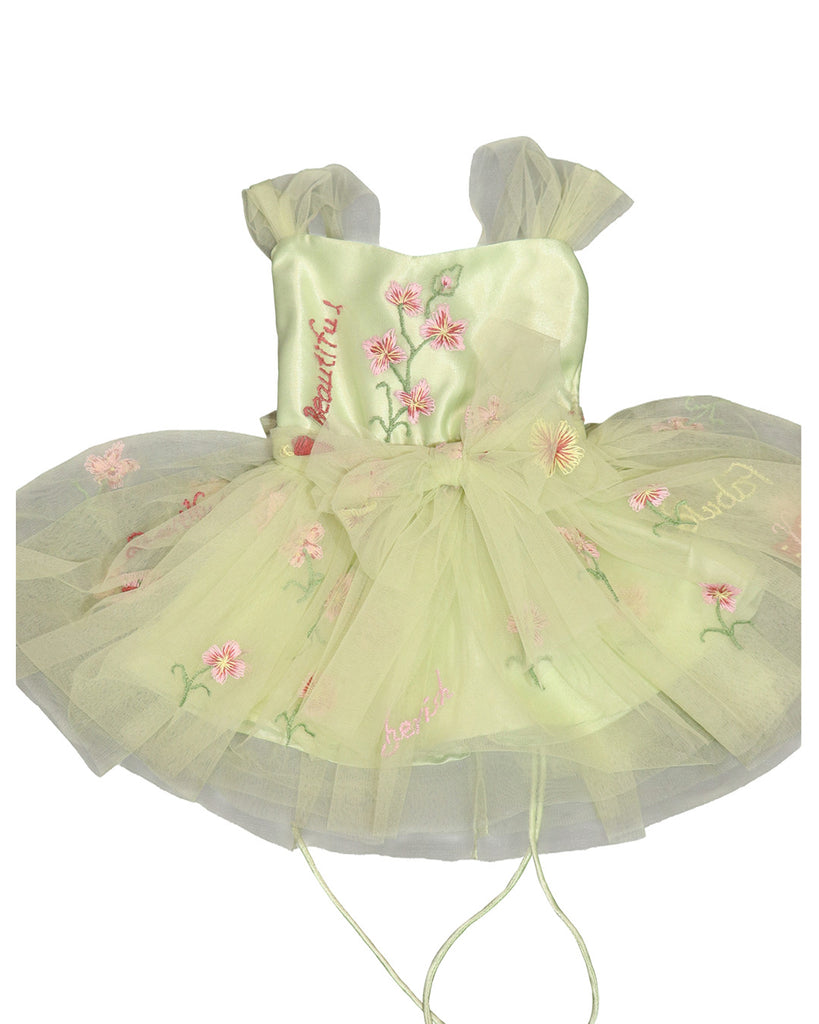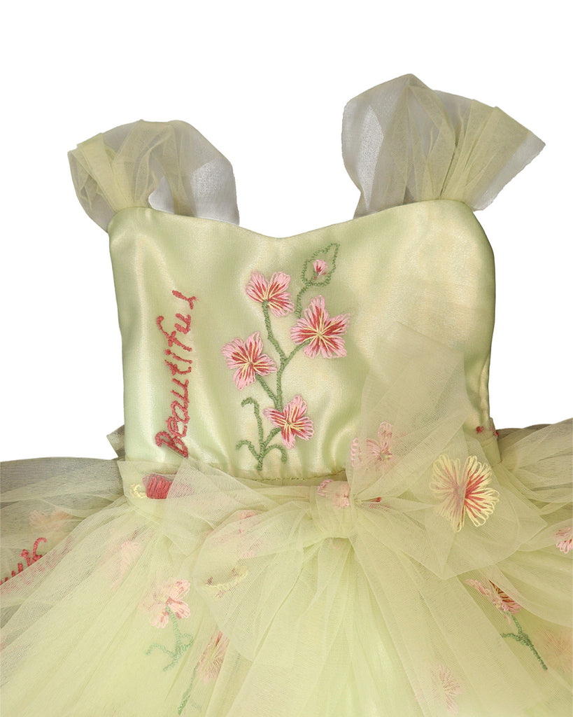 Straight out of a fairy tale, this pastel green gown is adorned with floral embroidery and flutter sleeves. Its dreamy net layers make it perfect for garden events and magical moments — designed by a Fashion Designer in Pune and ideal as a trendy kids loungewear set.