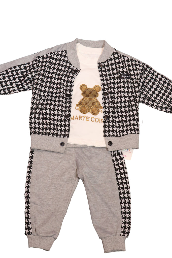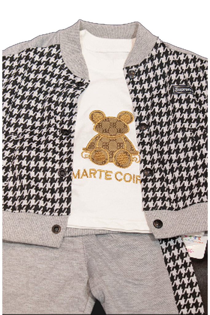 Classic cuteness with a designer twist! The Teddy Luxe Set features a crisp white tee with a plush teddy and “Marte Coirs” print, paired with comfy grey joggers detailed with trendy houndstooth stripes — a must-have from a Fashion designer in Pune and the perfect trendy kids loungewear set.